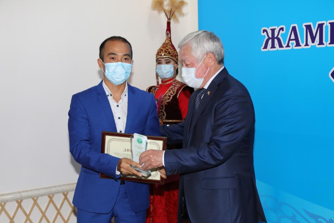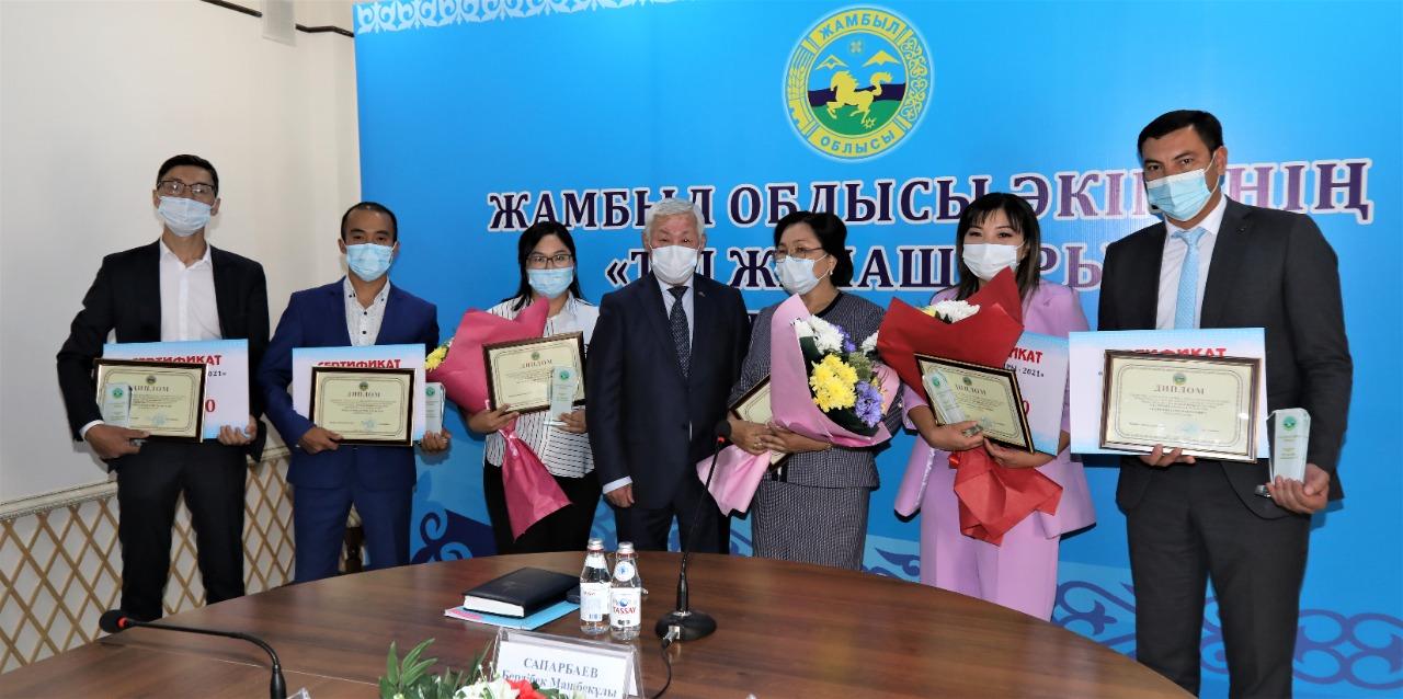 Атап айтқанда, «Тіл майталманы» аталымы бойынша М.Х.Дулати атындағы Тараз өңірлік университетінің филология және журналистика кафедрасының меңгерушісі Күлзинат Қарымбаева, «Тіл мерейі» аталымы бойынша Тараз қаласы әкімдігі білім бөлімі №32 орта мектебі директорының орынбасары, украин ұлтының өкілі Тарас Леоненко, «Тіл шебері» аталымы бойынша Тараз қаласындағы физика-математика бағытындағы Назарбаев зияткерлік мектебінің химия пәнінің мұғалімі, облыстық , республикалық тіл байқауларының жеңімпазы, дүнген ұлтының өкілі Нұрзада Даутова, «Тіл-қазына» аталымы бойынша облыстық «Тілдерді оқыту» орталығының аға әдіскері, мемлекеттік тілді оқыту әдістемелік құралдарының авторы Шынар Бахытбекқызы, «Тіл тірегі» аталымы бойынша Халықаралық Тараз инновациялық институтының имидждік жұмыс және қоғаммен байланыс секторының жетекшісі, педагогика ғылымдарының магистрі Бақтияр Бекназаров, «Тіл сақшысы» аталымы бойынша Тараз қаласы, Ы.Дүкенұлы атындағы мәдениет үйінің қоғамдық қызметкері, «Жаңа-Ру» үкіметтік емес ұйымының еріктісі Жандос Байкөбеков марапатталып, әрқайсысы 300 мың теңге көлемінде сыйлыққа ие болды.