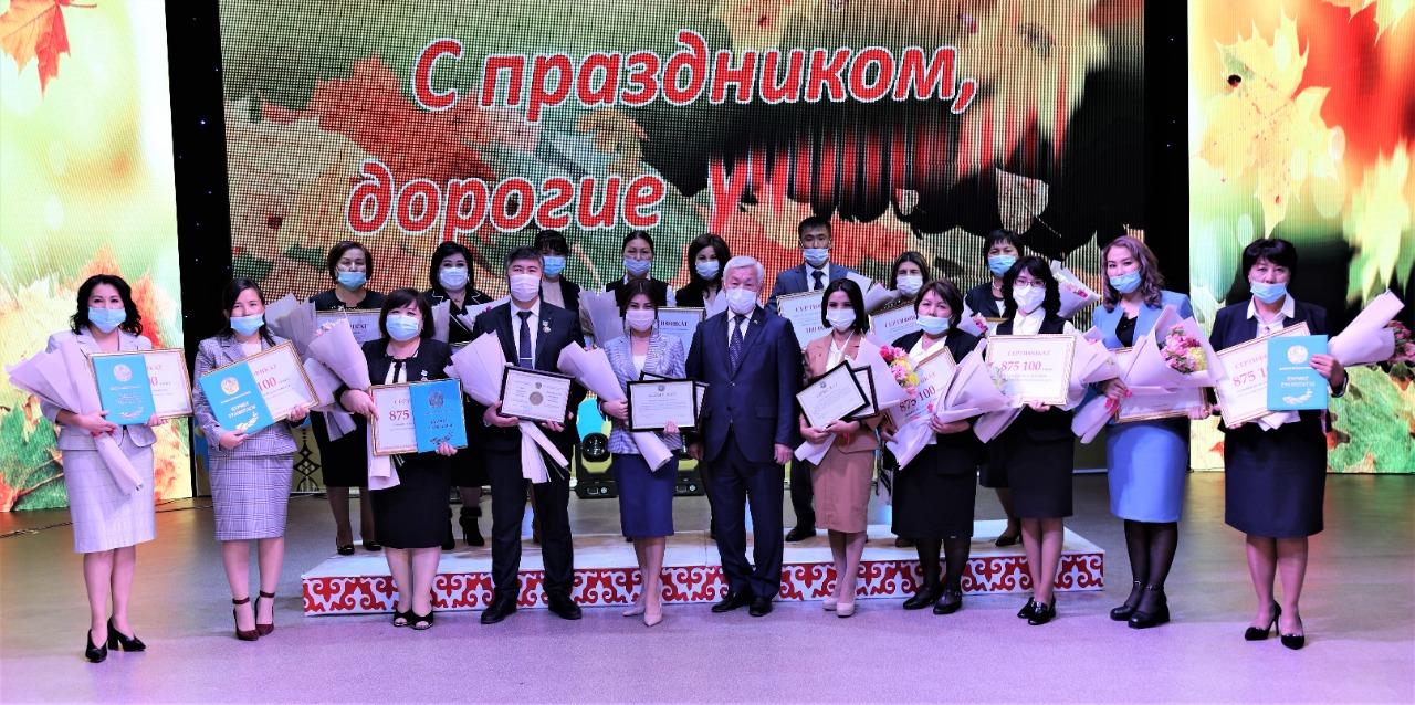 Глава региона в ходе торжественного мероприятия наградил лучших педагогов региона. Победители республиканского конкурса «Лучший педагог» учитель химии школы-гимназии №5 имени Жамбыла (Тараз) Сандугаш Нуртаева, учитель географии областного лицея-интерната для одаренных детей «Білім-Инновация» (Тараз) НурланСуанбеков, учитель химии гимназии имени ГаниМуратбаева (Байзакский район) МолдирРахметкулкызы получили сертификаты на 2 млн. 917 тыс. тенге и благодарственные письма акима области. Победители областного конкурса «Лучший педагог» отмечены сертификатами на 875 тыс. тенге и благодарственными письмами акима области. Педагоги и методисты дошкольных, дополнительных и специальных организаций образования области получили сертификаты на 100 тыс. тенге.