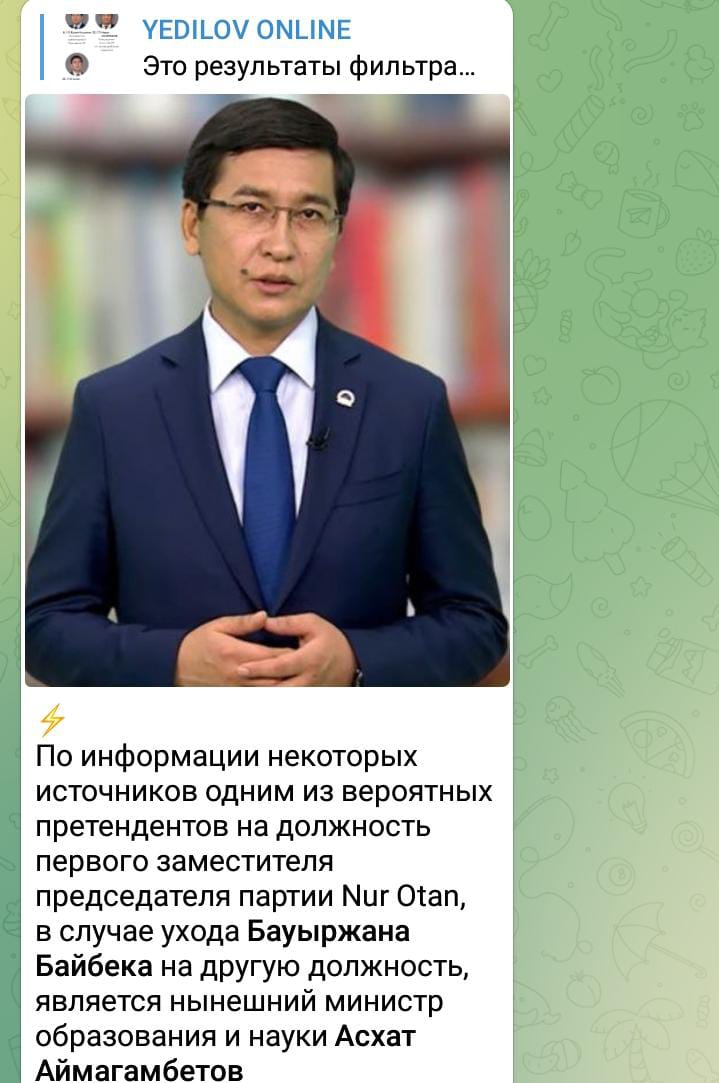 «По информации некоторых источников одним из вероятных претендентов на должность первого заместителя председателя партии Nur Otan, в случае ухода Бауыржана Байбека на другую должность, является нынешний министр образования и науки Асхат Аймагамбетов» деп жазды Е. Едилов.