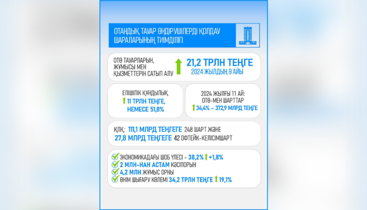 Үкімет осы жылы кәсіпорындарды одан әрі ірілендіруге және қосылған құны жоғары өнім шығаруға баса назар аудара отырып, отандық тауар өндірушілерді қолдау жөнінде бірқатар шаралар қабылдады. Осындай шаралардың бірі шетелдік әлеуетті өнім берушілердің тауарларды, жұмыстар мен көрсетілетін қызметтерді мемлекеттік сатып алуға және квазимемлекеттік компанияларды сатып алуға қатысуына қол жеткізуін шектеу болып саналады. Биыл тізбе 3 еседен астамға – 4 536 атауға дейін кеңейтілді. Нәтижесінде, тек 2024 жылдың 9 айында мониторинг субъектілерінің тауарларды, жұмыстарды және көрсетілетін қызметтерді сатып алу көлемі 21,2 трлн теңгені құрады, оның ішінде елішілік құндылығы 11 трлн теңгеге немесе 51,8%-ға жетті.