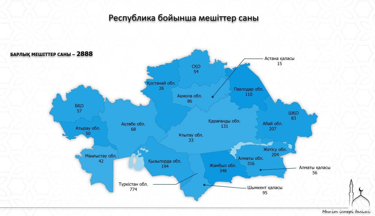 ҚМДБ мешіт істері бөлімінің меңгерушісі Марат Жаппасбаевтың мәліметінше, 2888 мешіттің 1-уі республикалық, 3-уі мегаполистік, 17-сі облыстық, 434-і қалалық, 162-сі аудандық және 2275-і ауылдық мешіт. Бүгінгі таңда тағы 257 мешіттің құрылысы жүріп жатыр.