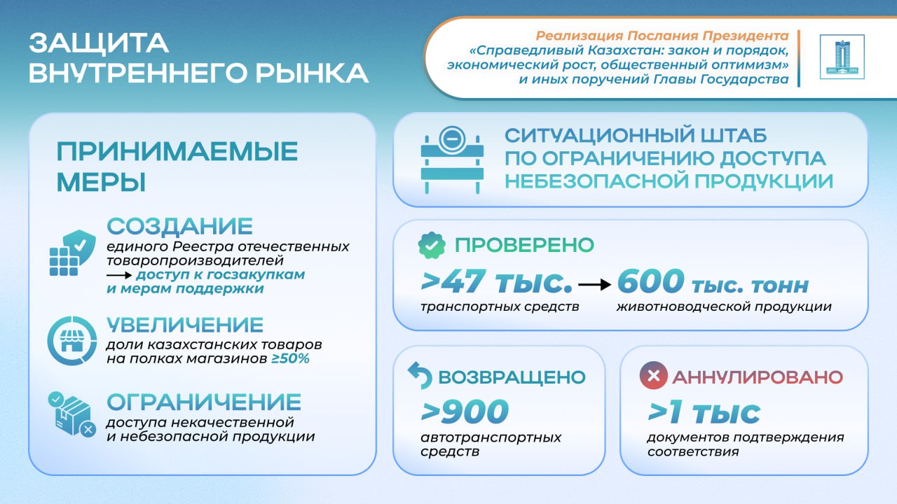 Реализация Послания Президента: 50% полок в магазинах займут казахстанские товары, пресечен ввоз некачественной продукции