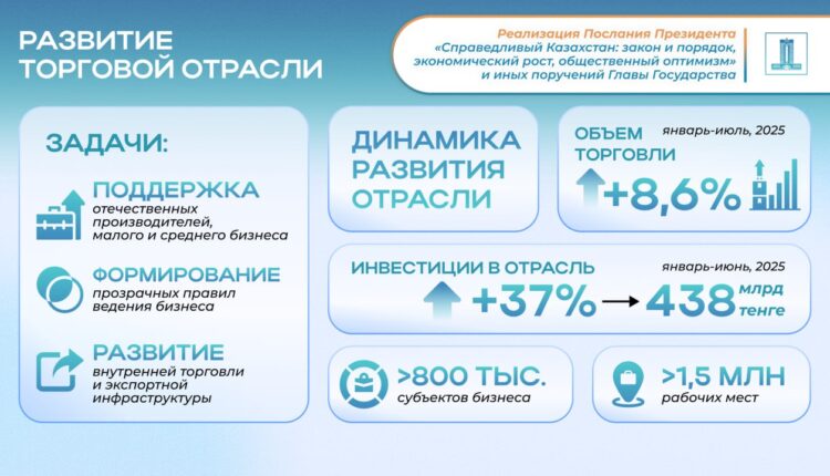 За январь–июль 2025 года объем торговли увеличился на 8,6%, а инвестиции в отрасль за первое полугодие выросли на 37%, достигнув 438 млрд тенге.