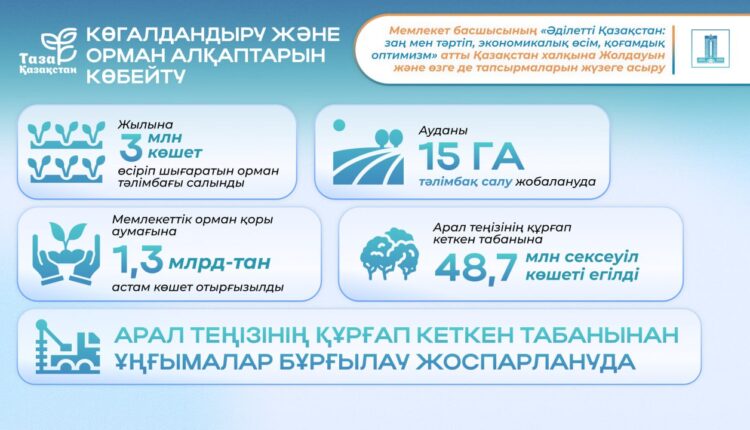 «Мемлекеттік орман қоры аумағына 1 млрд 369 млн көшет, оның ішінде Арал теңізінің құрғаған түбіне сексеуіл көшеттерінің 48,7 млн данасы егілді»,