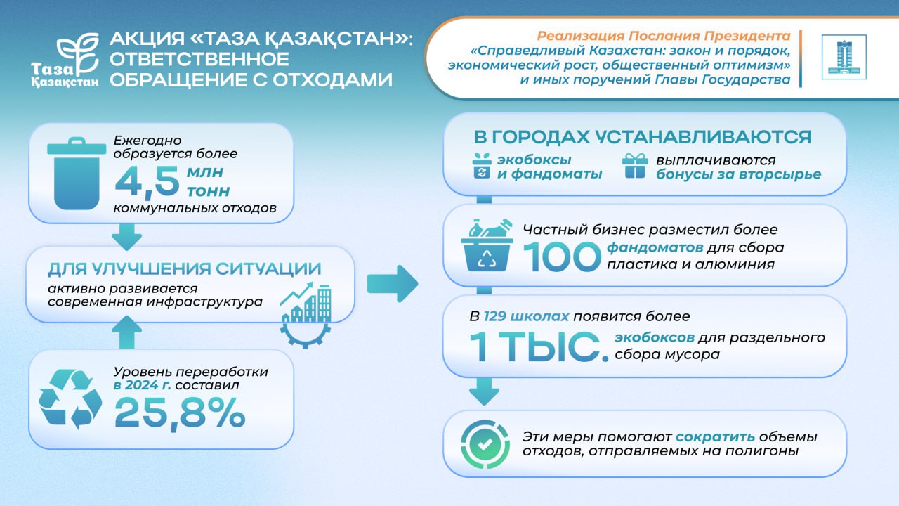 В частности, в республике разработана Концепция развития экологической культуры «Таза Қазақстан» на 2024-2029 годы. Документ ориентирован на комплексный подход к формированию экологической культуры.