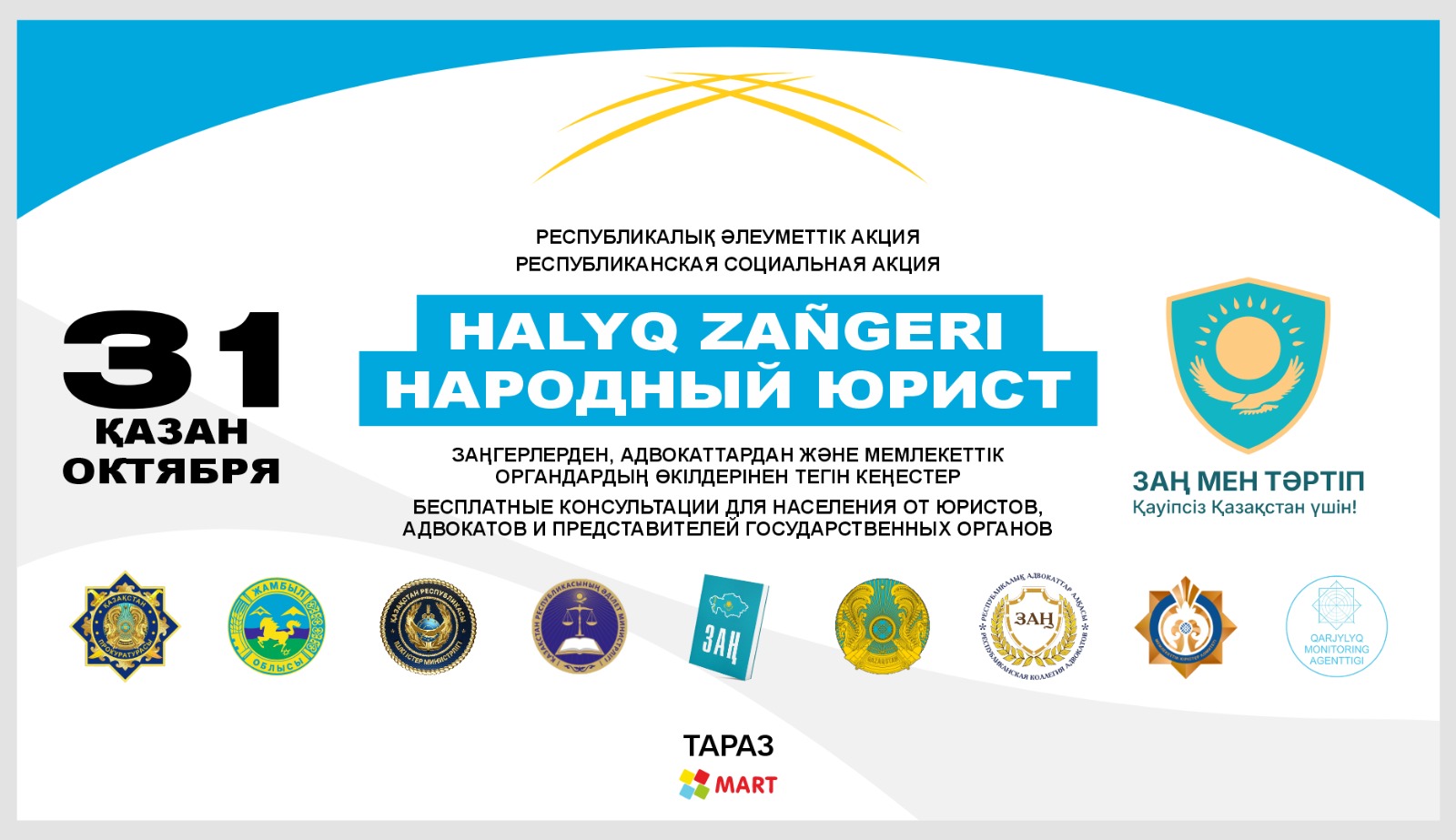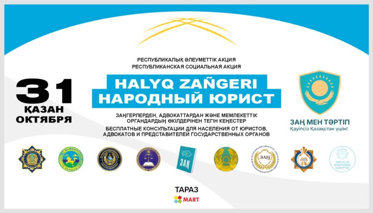 Жамбыл облысының прокуратурасымен «Халық заңгері» Республикалық акциясы шеңберінде 2025 жылдың 31 қазан күні сағат 17:00-19:00 уақытында Тараз қаласы, Төлеби даңғылы, №27, «Март» сауда орталығында азаматтарды қабылдау акциясы өткізіледі.