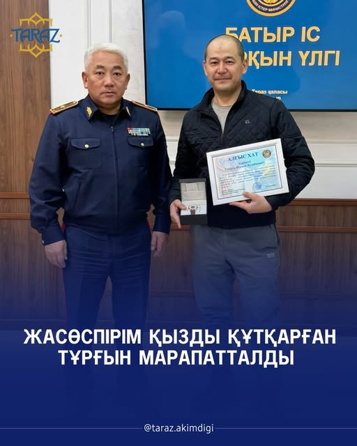 Жамбыл облыстық Полиция департаментінде 13 жасар жасөспірім қызды құтқарып қалған Тараз қаласының тұрғыны Нуркен Умаровты марапаттау рәсімі өтті.
