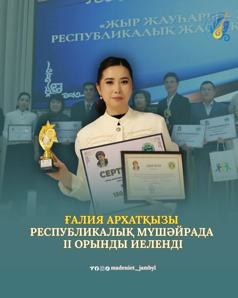 Жамбыл облысы әкімдігінің мәдениет және тілдерді дамыту басқармасының баспасөз хатшысы, облыстық айтыскер ақындар, жыршы-термешілер орталығы «Шығармашылық» бөлімінің басшысы Ғалия Абылай республикалық ақындар мүшәйрасында жүлделі ІІ орынды иеленді.