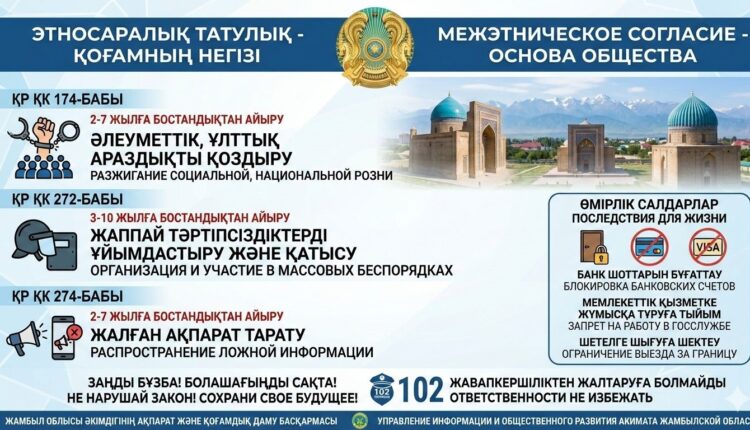 Біздің басты байлығымыз — елдегі тыныштық пен этносаралық татулық. Кез келген тұрмыстық жанжалды ұлттық сипатқа бұрмалау немесе арандатушылыққа бой алдыру ауыр қылмыс болып саналады.